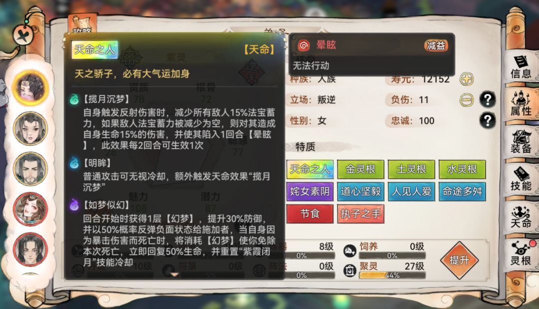 天命三:如梦似幻 回合开始获得1层幻梦,提升30%防御,以50%概率反弹负面状态给施加者,因暴击伤害死亡,消耗1层幻梦,免除死亡并立即恢复50%生命,并重置职业技能紫霞闭月