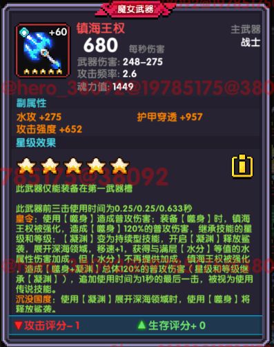 四星效果:装备噬身-(新水紫技能),每次平a造成紫技能的120%的普攻伤害,凝渊-(新水橙技能)变为持续性技能,开启凝渊时,获得满层水分-(20层)的水属性伤害加成,水分不再提供水属性伤害加成,同时魔女武器--镇海王权获得强化,普攻造成(紫技能+橙技能)总体120%的普攻伤害,且追加一次使用时间为1s的最后一击,试作使用传说技能。