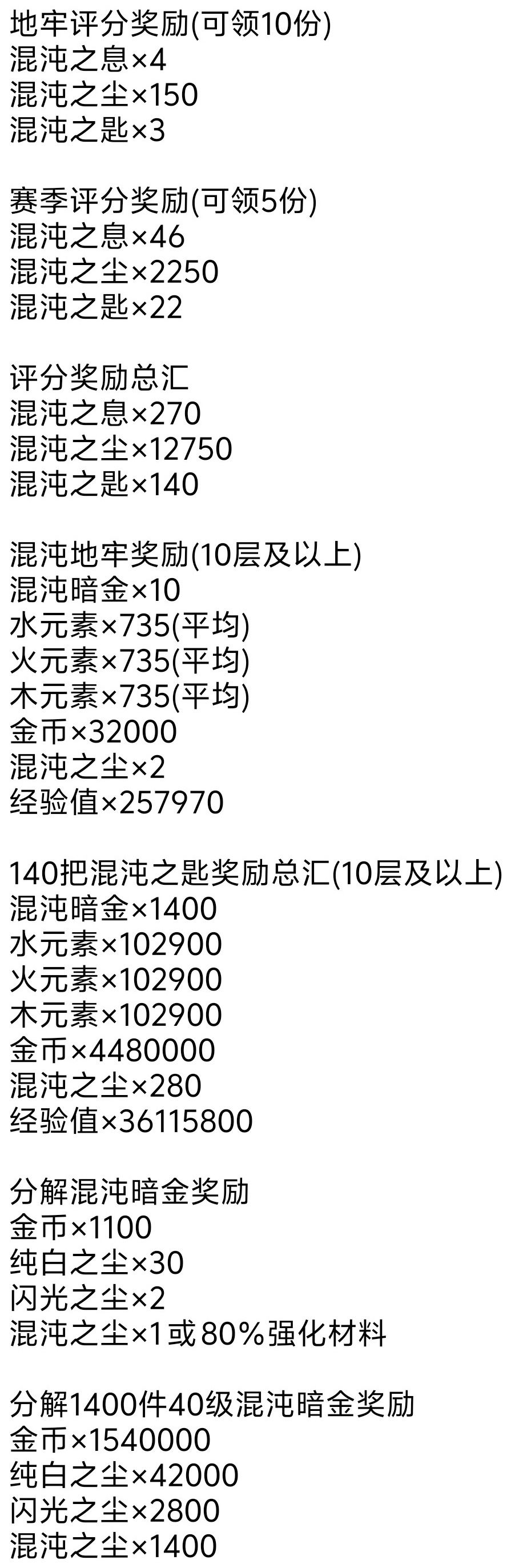 混沌地牢分为地牢评分奖励和赛季评分奖励,地牢一共有10张图,5职业领奖次数共享,赛季评分奖励则是5职业分别可以领一轮,总计可以白嫖的资源已经写在图上了(不包括其他活动来源).