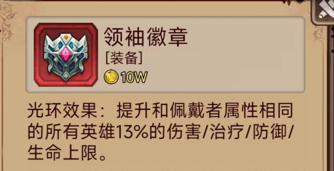 光环神器,无论是搭配水队还是金队亦或者刷图的火队都非常好用,水队推荐男镇长/魔术携带,火队推荐女镇长携带,遗忘金队药剂携带,爬塔医生携带,附魔精华推荐,优先速度双防,附魔出命中也可