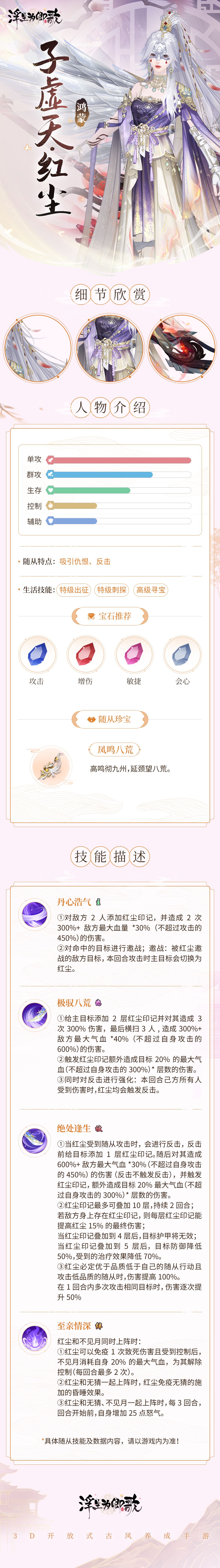 作为侍卫,子虚天·红尘有着极强的攻击能力,单攻群攻都十分出色!适合阁下用来吸引仇恨、反击对方~