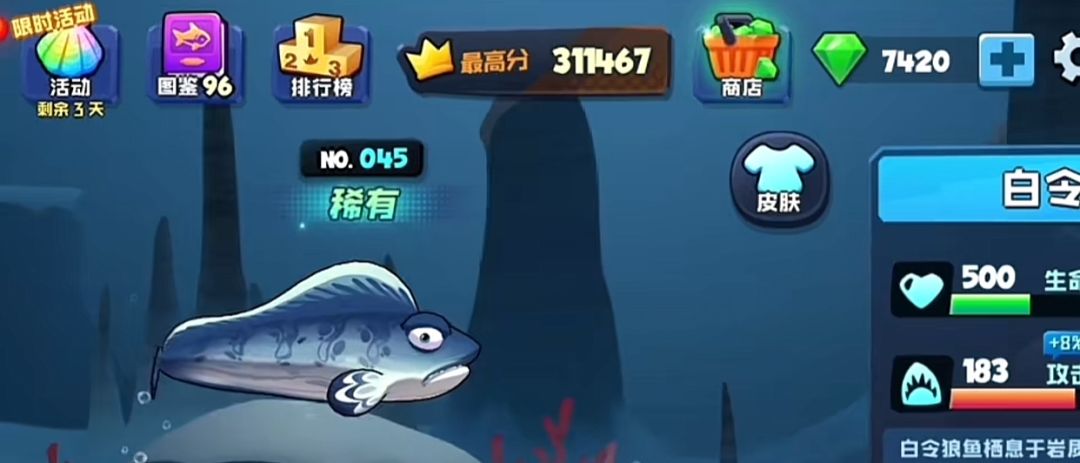 ♠它的技能是【决斗】,在我们到达三级之后,只要碰到同类就可以使用技能,胜利之后就会获得攻击力。这攻击力的加成,会触发白令海鱼的红眼。当一段时间没有和其他鱼类决斗,红眼就会消失,这也意味着攻击力加成也消失了。玩家们都知道,这一技能在游戏中是非常的稀缺的。我们也只有在有些大秘宝的技能中,才可以获得同类相食的能力。