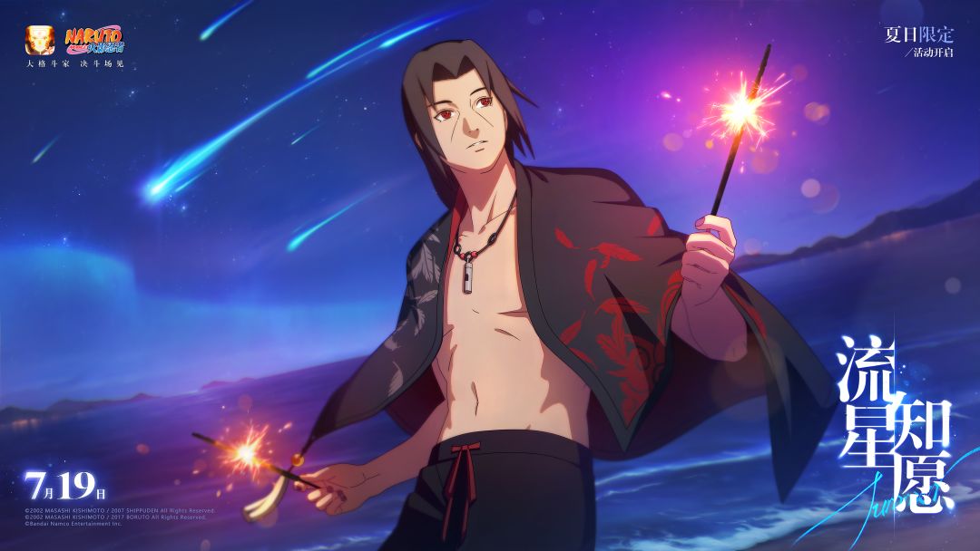 这个编织的夏夜里,有流星的指引、有烟火的陪伴,他心中之愿也在星空下轻轻绽放。——流星知愿,7月19日夏日季限定主题活动开启,全新夏日季忍者宇智波鼬「夏日限定」即将上线!