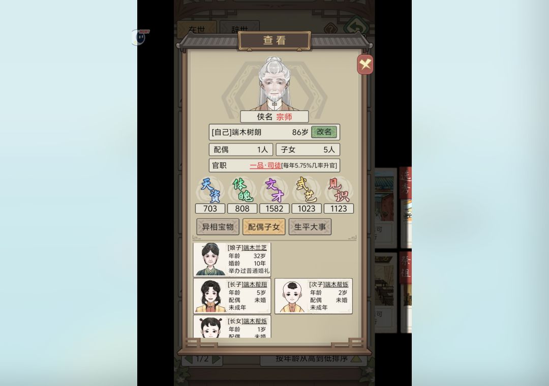 5.关于传承。想长寿需要点体魄,我目前无脑选择见识,文才,武艺。高寿前期可以刷广告,我目前认为高寿没有太大必要,活太久,后代太多,不容易分配属性点,会多一些平庸的后人。