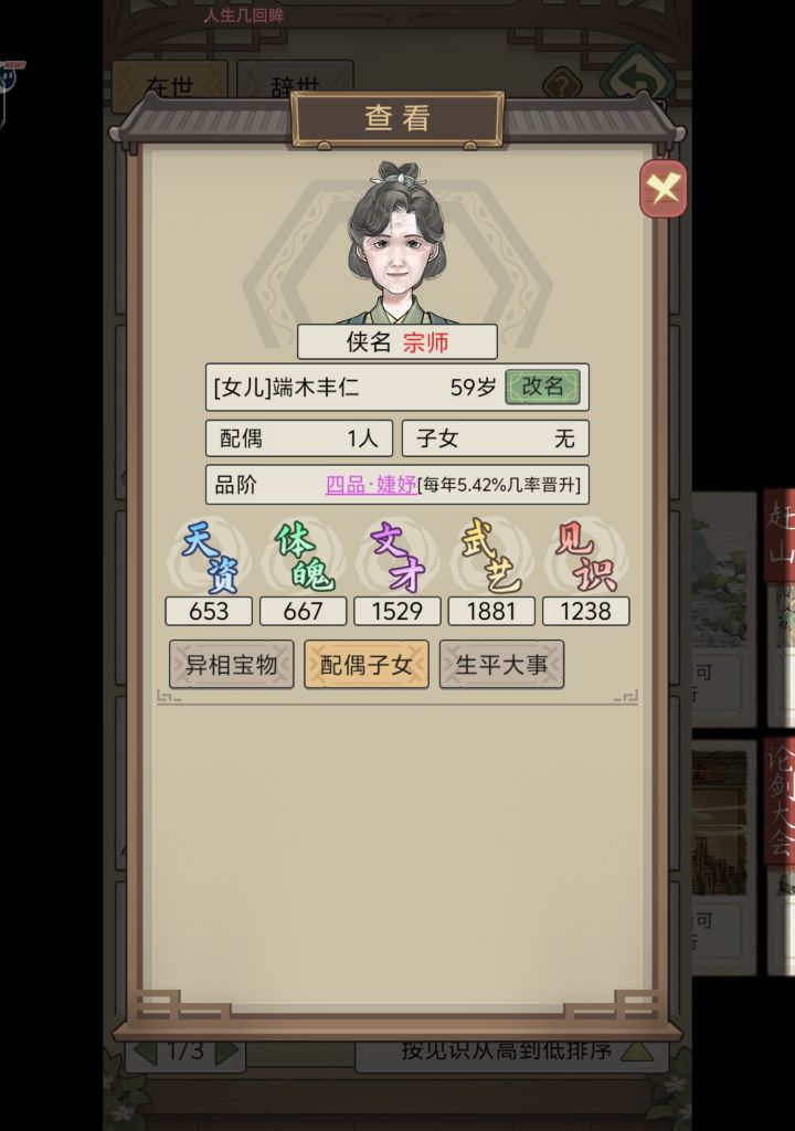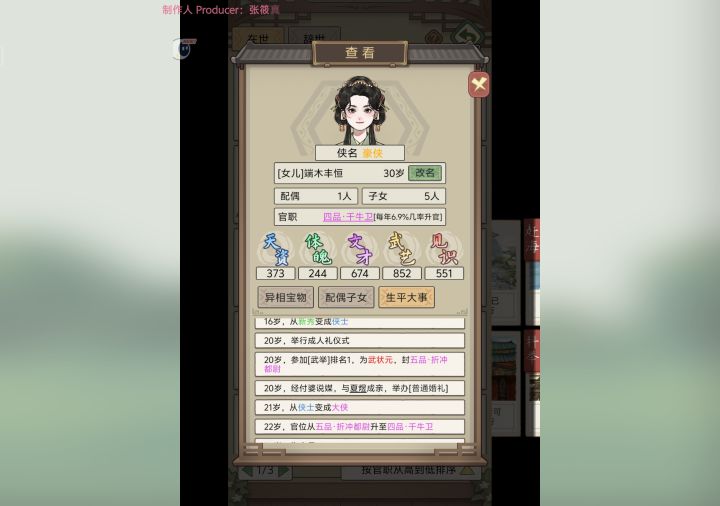 【见识】高的可以去选秀,我目前把见识高的女孩子都送入宫了,当然不是无脑都送,毕竟入宫了女儿的选项里没有配偶子女,所以不可以选入宫的女孩子做继承人。悄咪咪夸一嘴我的女儿!二十就是武状元,太厉害了!