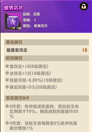 4件套:如果玩家局内总等级达到12,机甲伤害上升40%。