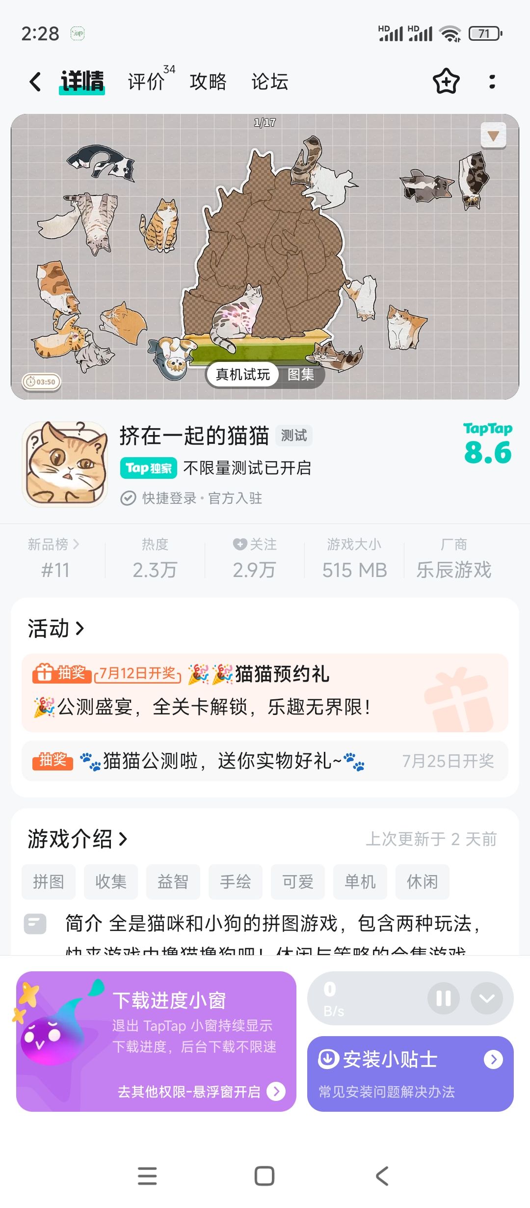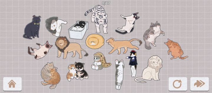 另一种模型是把两片分开的猫猫拼图拼在一起消除,喵喵叫有的,而且!最令人惊喜的是它在最后会把消除掉的拼图放出来让你按自己喜欢的样子摆好欣赏,不得不说真的很人性化小细节!