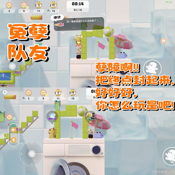种类繁杂的道具就是在鼓励玩家“互坑“,包括不限于可乐喷气机、冷冻机、跑步机、图钉,乃至与围墙等,无论是天罗地网的弹幕狙击,还是封心锁爱的终点围墙流,只有你想不到,没有脑洞玩家做不到。