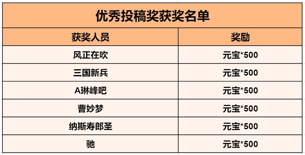 获奖说明:设计用心的高质量投稿,技能设计详细(设计亮点包括但不限于:贴合历史情节/有具体的攻血数值/考虑到了战场平衡和将士定位)。