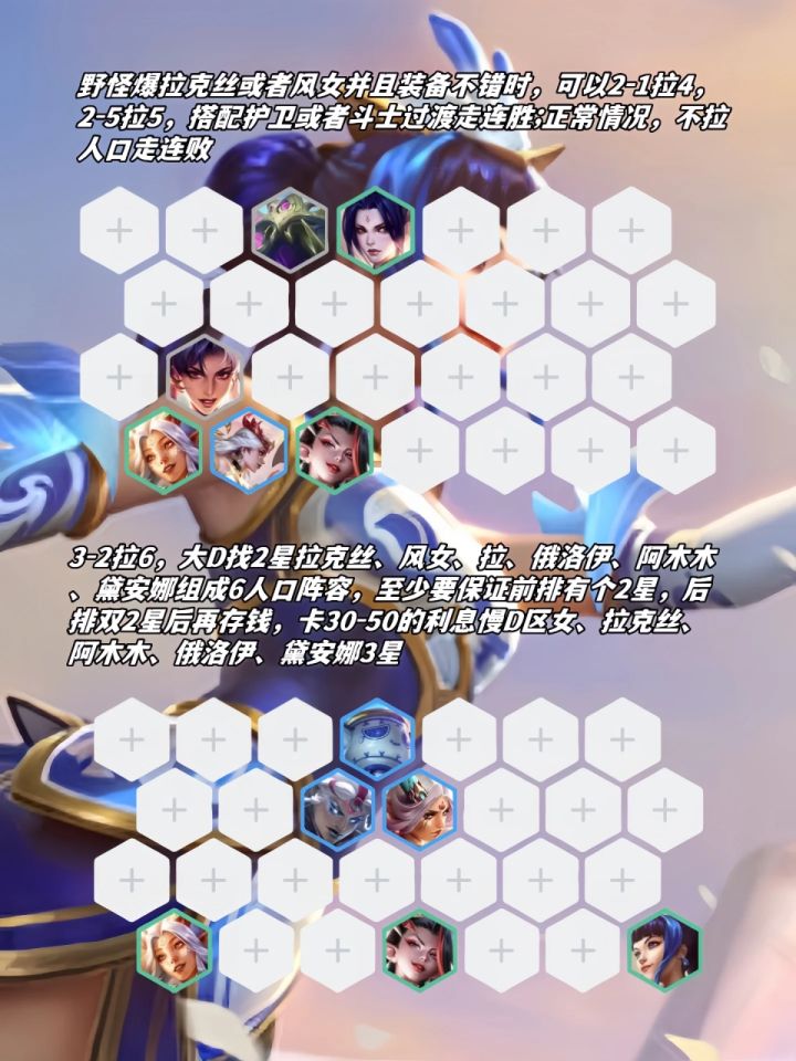 新手宝宝可以看过来!圣贤拉风冷门偷分阵容!拉克 斯技能既能控制又有伤害,风女作为第二个C也是伤 害爆炸!前排阿木木坦度拉满!就是有点赌的成分需 要大量三星
