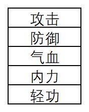 1、战斗基础属性:攻击、防御、气血(生命值)、内力(真实伤害)、轻功(速度)