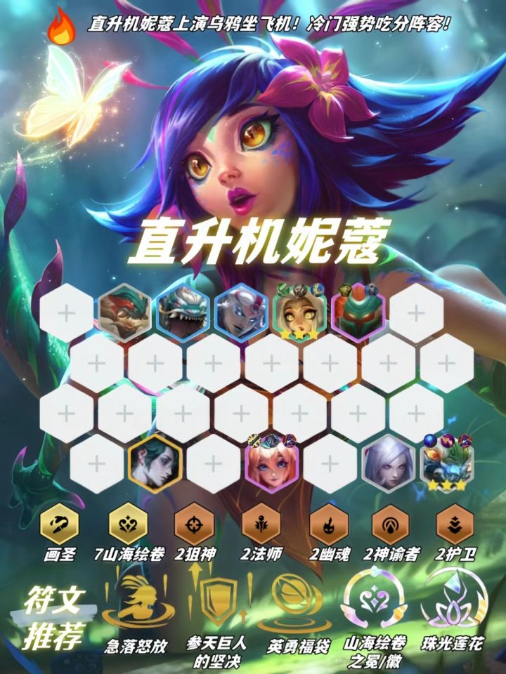 热门阵容玩厌了?来点有趣的阵容! 条件:有符文“急落怒放”才可玩! 妮蔻回血高输出!