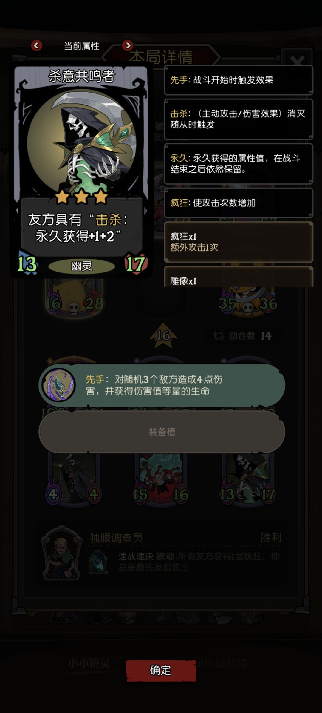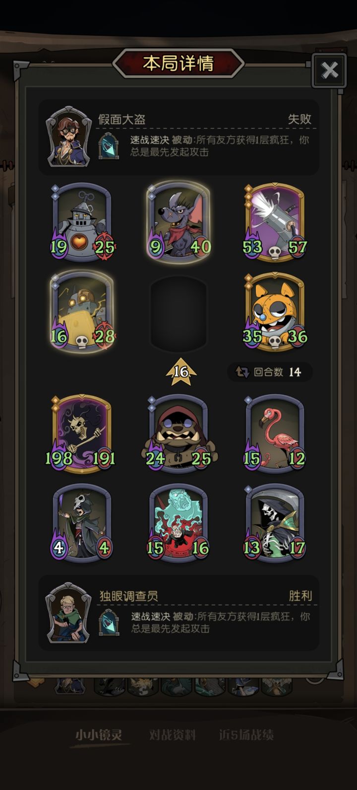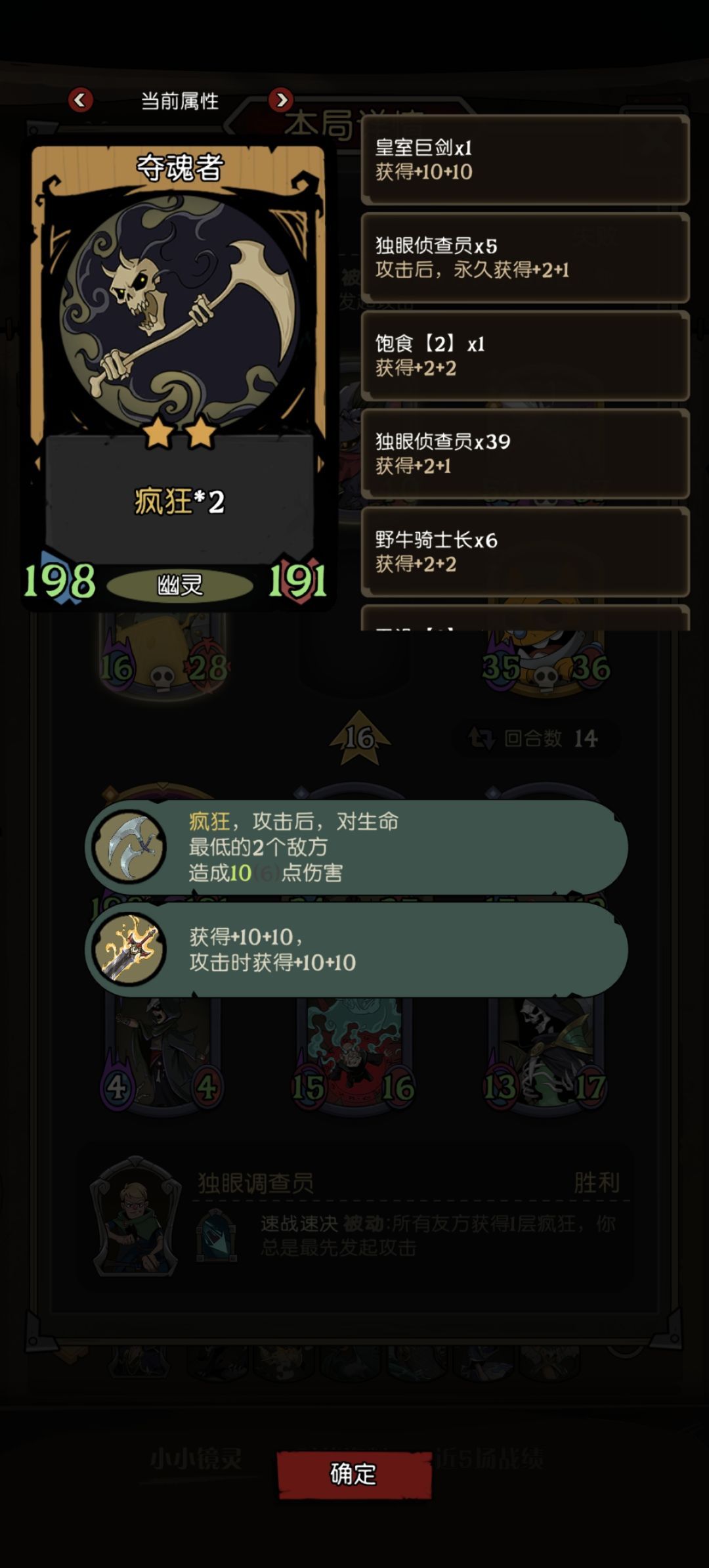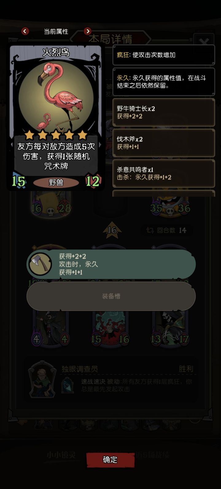 强制先手加疯狂,就代表着每回合必然会吃两次侦察兵,如果运气好能吃五次,升级飞快。搜到火烈鸟,附着上追猎者,一轮保底再加三张法术牌,其余击杀挂件,有啥用啥。