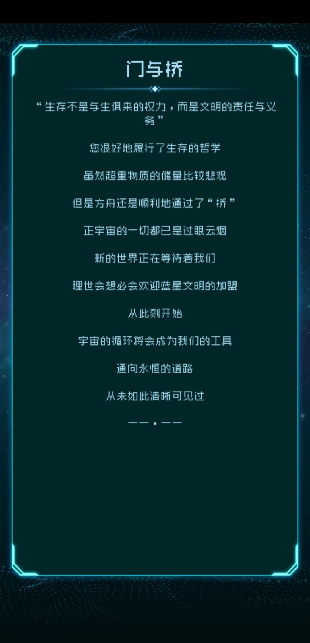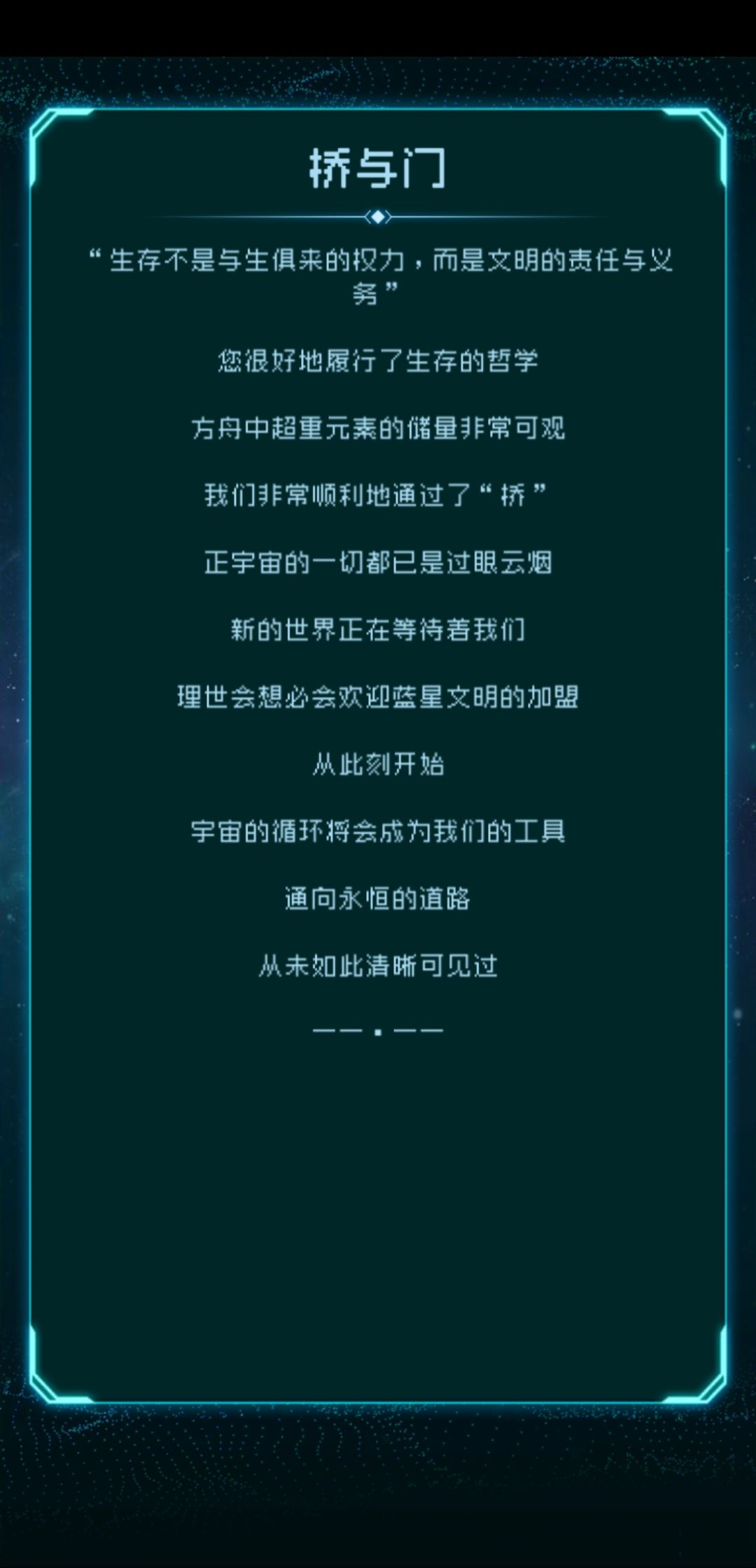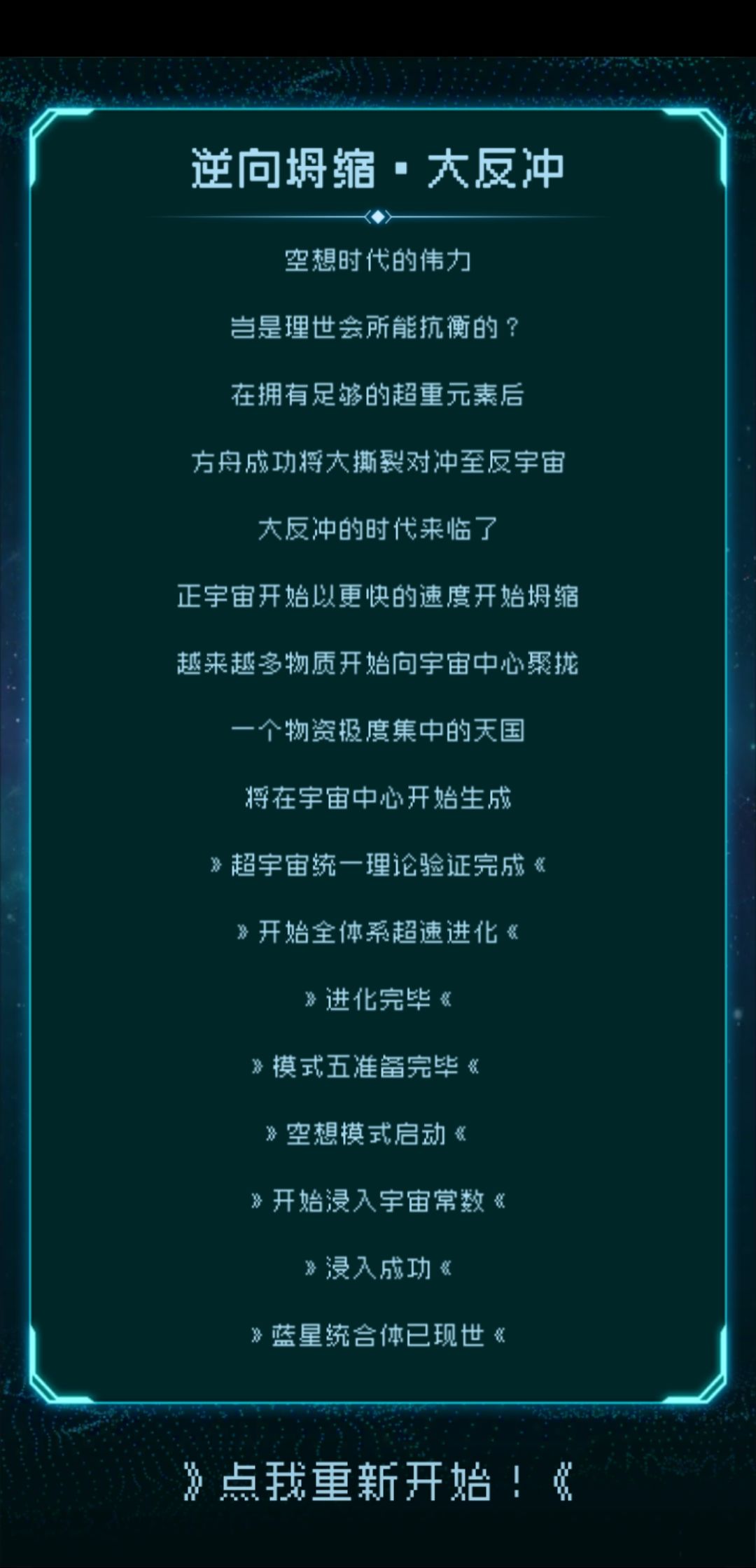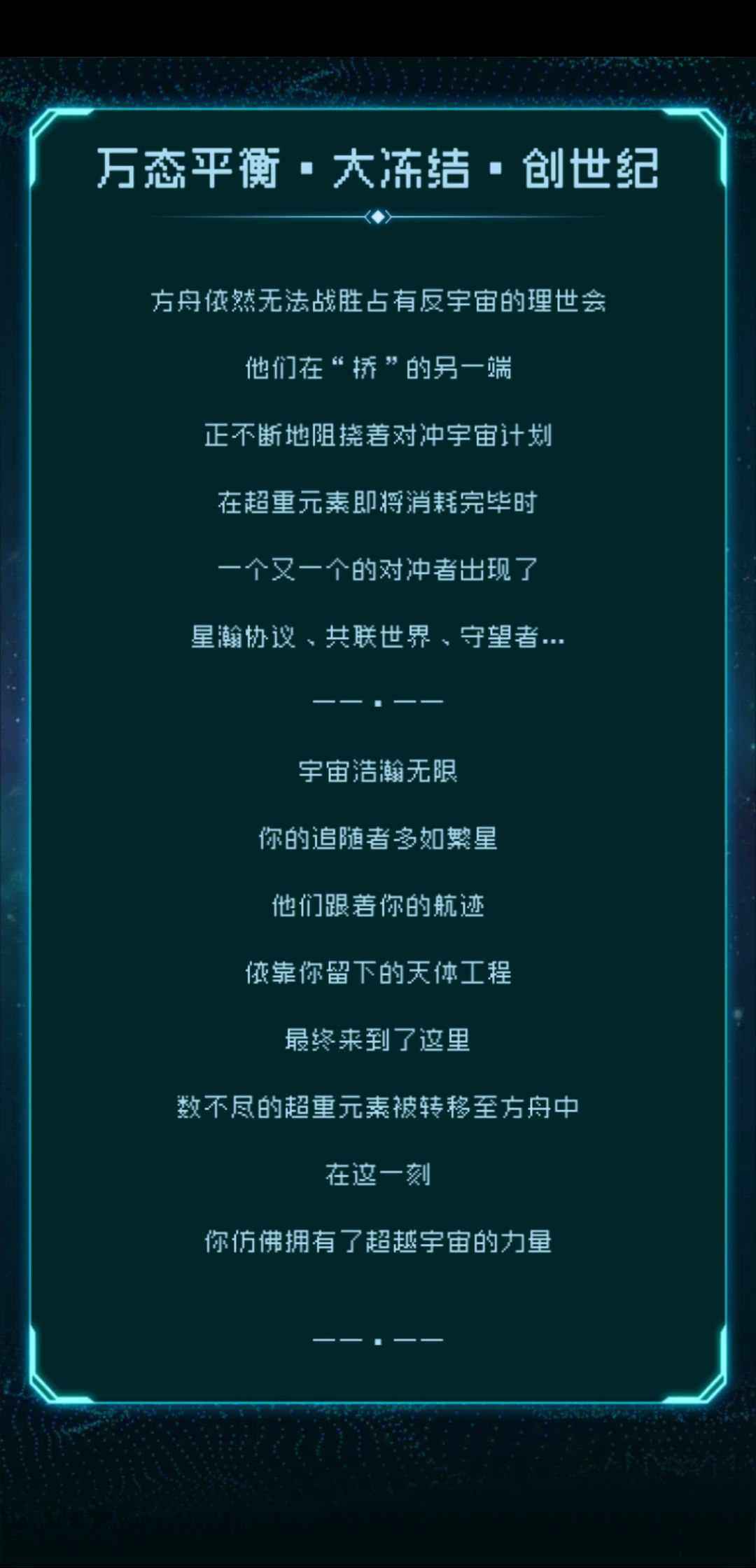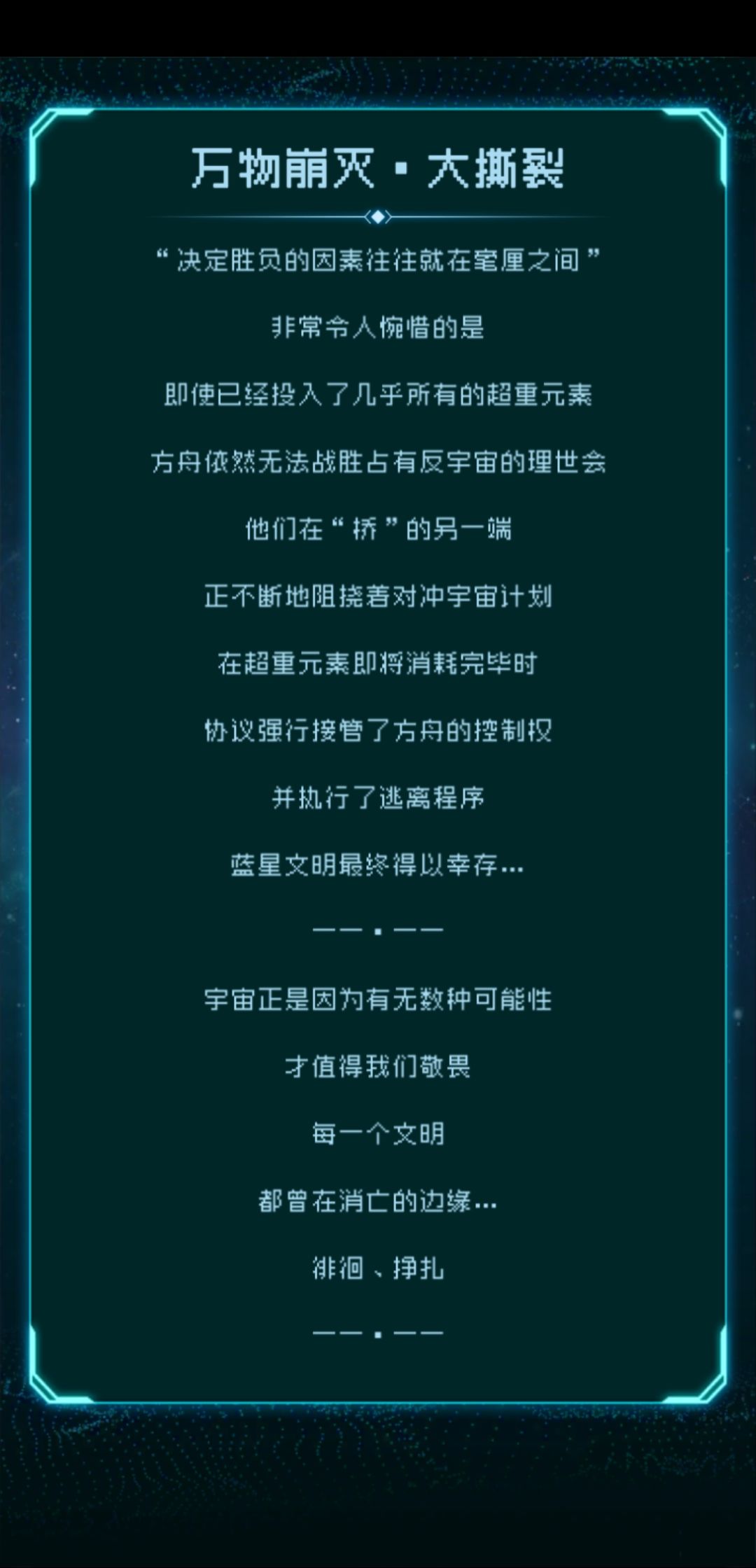 肝完4个结局后,开始了慢慢收集路(这里都没有使用过时间法则加速,只用了下线遁),除了星约与星瀚特殊星之子莱温,收割为记录官,机械嬗变为信使,我放的图9明显还有两个星之子格子,就算莱温的特殊性可以多算一个,还是多一个格子,我有两个猜想,所以继续开并使用时间法则,加速验证但都失败了,评论区我放上我的猜想和原因,就是不知道最后一个是没设置还是彩蛋亦或是隐藏太深(今天无聊玩了下大反冲结局,共联和星约一共三颗星球共生还是大反冲)
