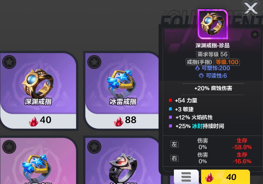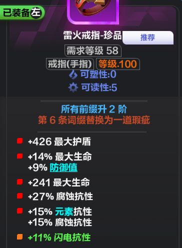 首先需要知道要做的装备的核心词条、次词条。比如我这个戒指,我玩的血盾蝉猫1,所以我在戒指上最要的是补护盾和抗性。所以我的核心词条就是①元素抗性/腐蚀抗性、②最大护盾、③最大生命/防御值,次核心可以是④腐蚀抗性、⑤力量、⑥最大生命、⑦击中诅咒等。