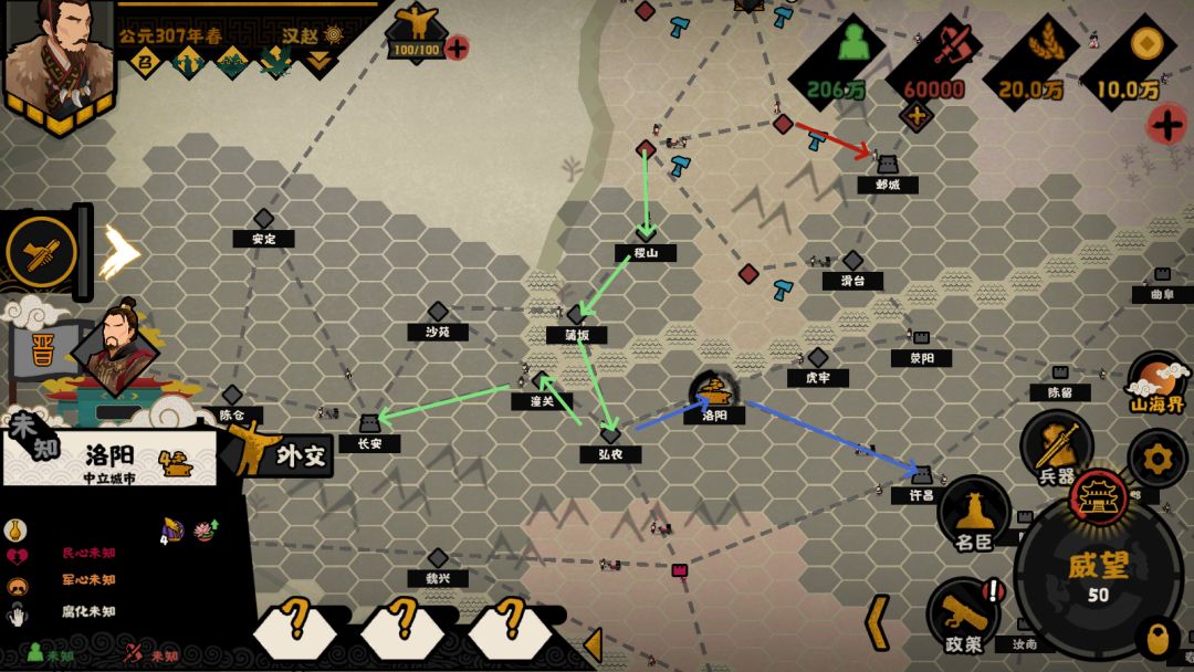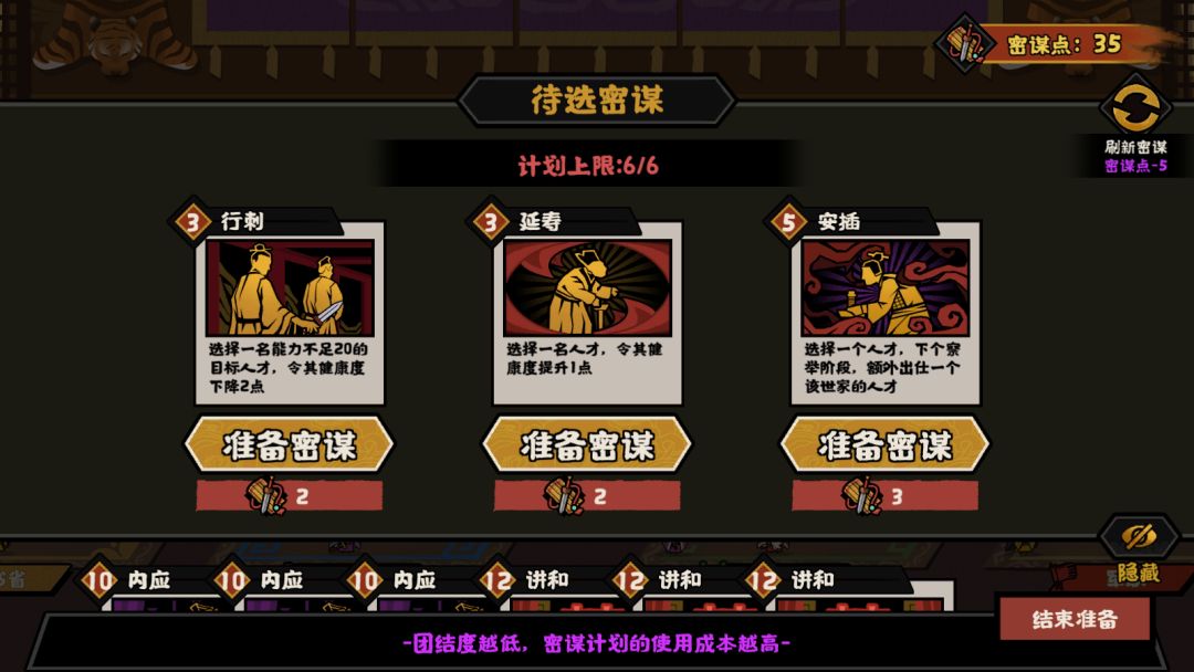 从这时候起,就需要在内政阶段尽可能平衡各方势力的影响值,同时保留谋略点,根据实际情况囤积【内应】、【讲和】、【尊奉】这三种密谋卡,其中【内应】与【讲和】用于补充谋略点和提高团结度,从而达成团结度80以上的任务,【尊奉】用于达成【兵战】政道达到☆5。