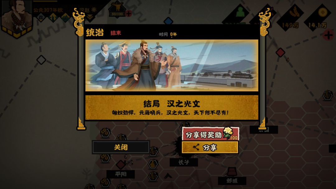 在普通难度以上,完成主要目标与次要目标,即可通过施行对应政策,同时达成高级结局与普通结局——汉之光文与乱国祸首