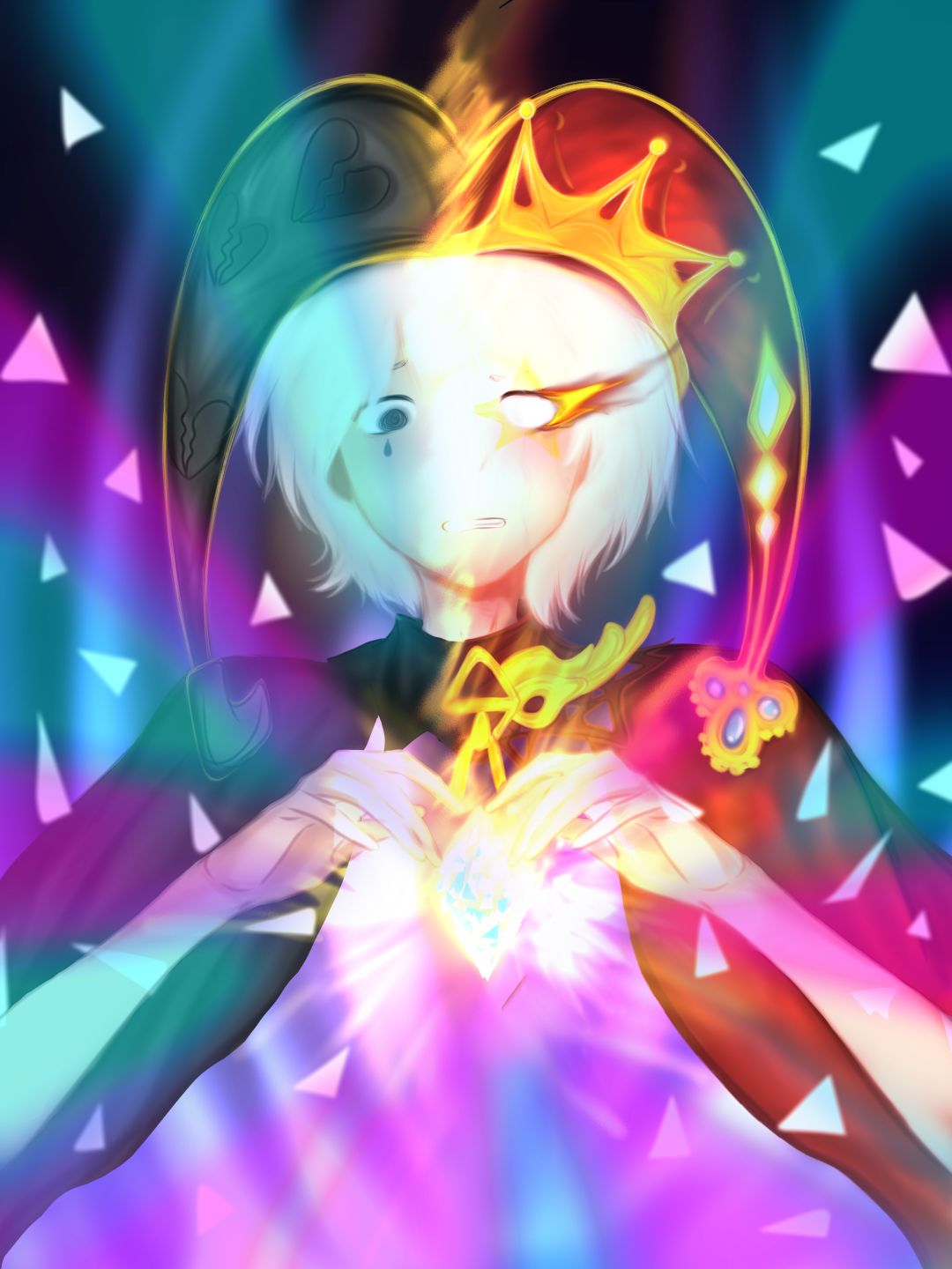面对空白纸好难起稿啊!去趟厕所,忽然脑瓜子一亮,回想起小丑打碎彩虹核心黑化的画面,想着就画一个双重人格,结果越画越不理想,可没办法啊!只能咽下那口气了(硬着头皮画下去)(不是很会画人,等过年买了平板我再好好学)