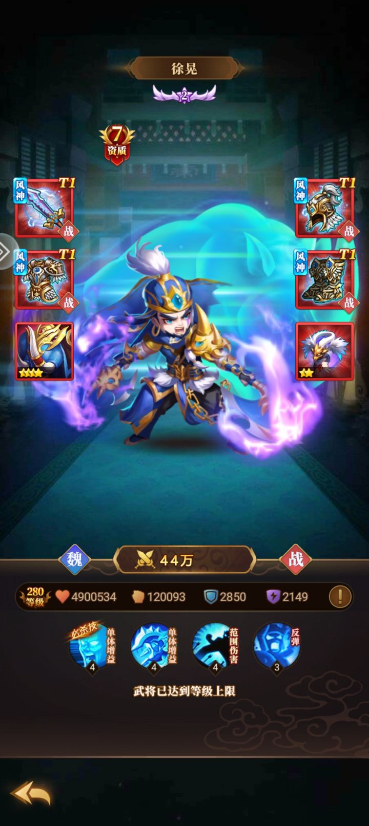 魏2,群2,帝4(附伤加12%),两射一战一刺一法7辅助(辅助回蓝+100%,非辅助回蓝+50%)