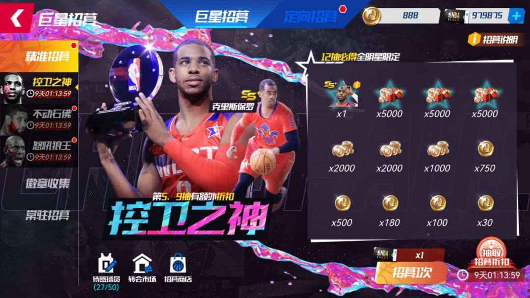 新增轮盘折扣!活动期间,可使用【精准招募函】在【精准招募-控卫之神】池中,招募全明星队保罗。每次“抽一次”,则随机解锁一个奖励格,获取奖励格中的奖励。至多抽取12次,成功将全明星队保罗签约入队!