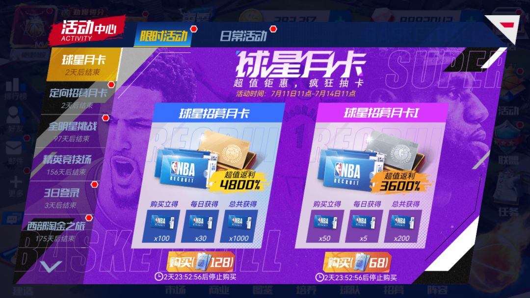 活动期间,经理人们可以购买特惠【传奇交易月卡】与【转会签约月卡】,购买后30天,每天领取定量的传奇交易函及转会签约函。