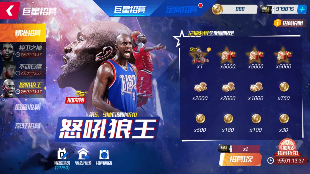 活动期间,可使用【精准招募函】在【精准招募-怒吼狼王】池中,招募全明星队加内特。每次“抽一次”,则随机解锁一个奖励格,获取奖励格中的“全明星球员”或“转会费”。至多抽取12次,成功将全明星队加内特签约入队!