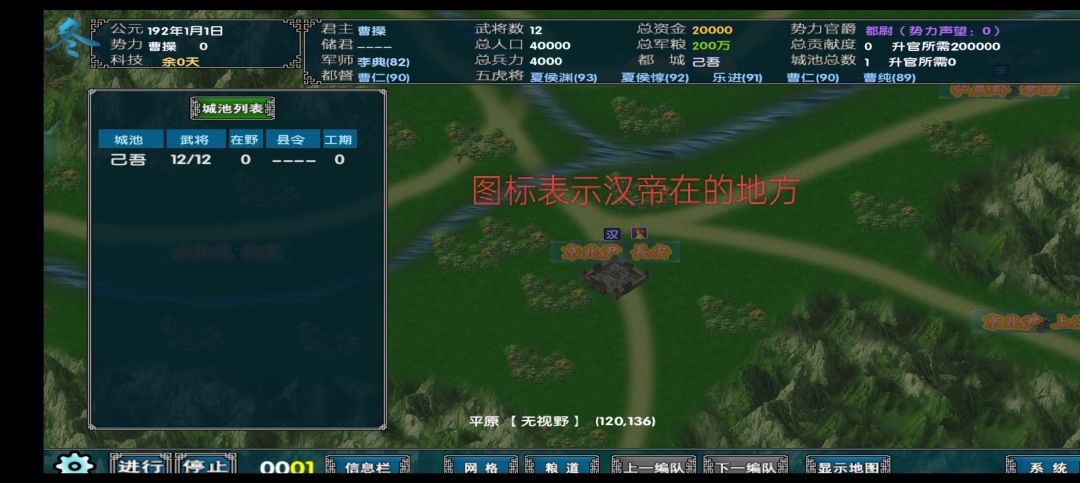 主公的官位在右上角,诸侯需要上供天子(3月),换取贡献提升,异族或乱党只需要城池数量。称帝后封王要在指定城池,如南郑汉中王,邺城魏王,成都蜀王,吴县吴王等(详情自寻)。
