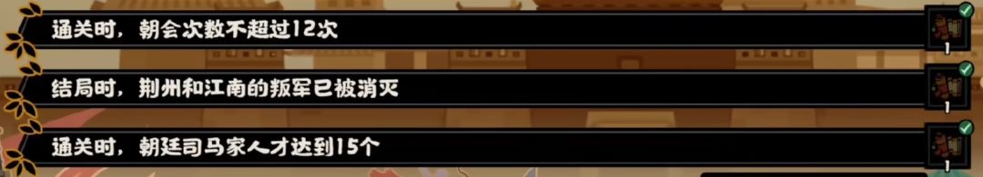 除了主要目标外,还有3个额外目标,完成他们可以获得国政点奖励。3个难度下的额外目标奖励是独立的,每个难度都能领取一次,完成高难度下的额外目标可以自动解锁低难度的奖励。难度也分为3种,剧情、普通、挑战,剧情难度下通关只能解锁常规结局,普通和挑战难度下完成所有额外目标,就能解锁高级结局,当然挑战还会多个金框。