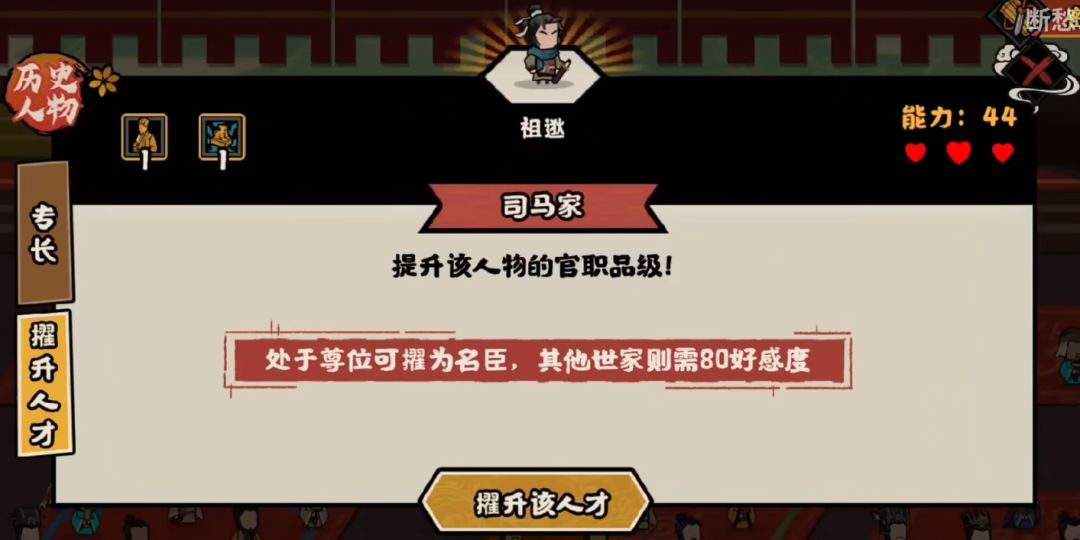 进入游戏后也增加了新的功能,首先是大家关注的名臣招募。第一批开放的剧本能招募3个名臣,都在衣冠南渡剧本中,分别是王导、葛洪、祖逖。招募分3步,第一步要让他们进入朝堂,其中王导开局就在,祖逖通过剧情事件加入,葛洪则需要通过司马家的察举概率获取,再安插到朝堂之上。第二步,把他们升到尊位,先通过控场升职把他们升到二级部门,然后用密谋“尊奉”或者完成对应人物的升尊位任务来升到尊位,其中王导开局就在尊位。第三步,通过擢升人才把他们变成名臣,这其中我们自己世家的人才可以直接擢升,比如祖逖和葛洪,其他世家的人才需要和这个世家的好感度达到80才能擢升,比如王导。