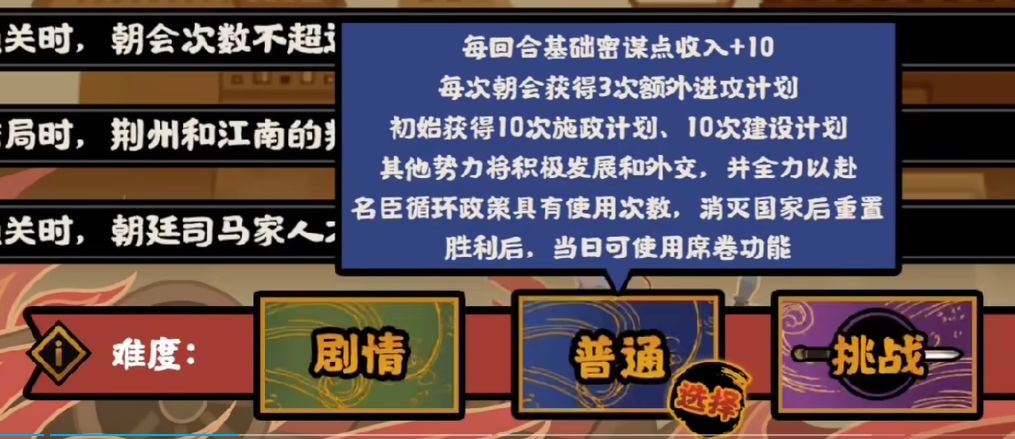这里的难度差异主要体现在官僚系统上,难度越高密谋点越少、团结度越低、其他世家更积极的安插人才、使用密谋。最重要的是国政计划也会减少,挑战模式更是没有任何额外的国政计划,只能在朝会的国政阶段获取。而在魏晋南北朝剧本中,任何行动都需要对应的计划才能施行。攻打其他国家需要进攻计划,施行政策需要施政计划,升级建筑需要建设计划,连升级武器都需要计划,没有计划可以说寸步难行。此外普通和挑战难度下,名臣的循环政策将限制使用次数,消灭国家后重置,但是胜利后可以使用席卷功能。