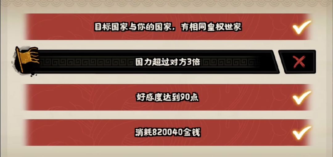 另一个新功能操控他国朝廷,当你的用间等级大于目标国家时,就能操纵他们的朝廷。主要有3种用法,第一种是联合,当你们拥有相同的皇权世家时,满足下面的3个条件就能建立联合统治。说是联合,实际上就是兼并,效果强大,但皇权世家是固定的,所以能用到的地方不多。