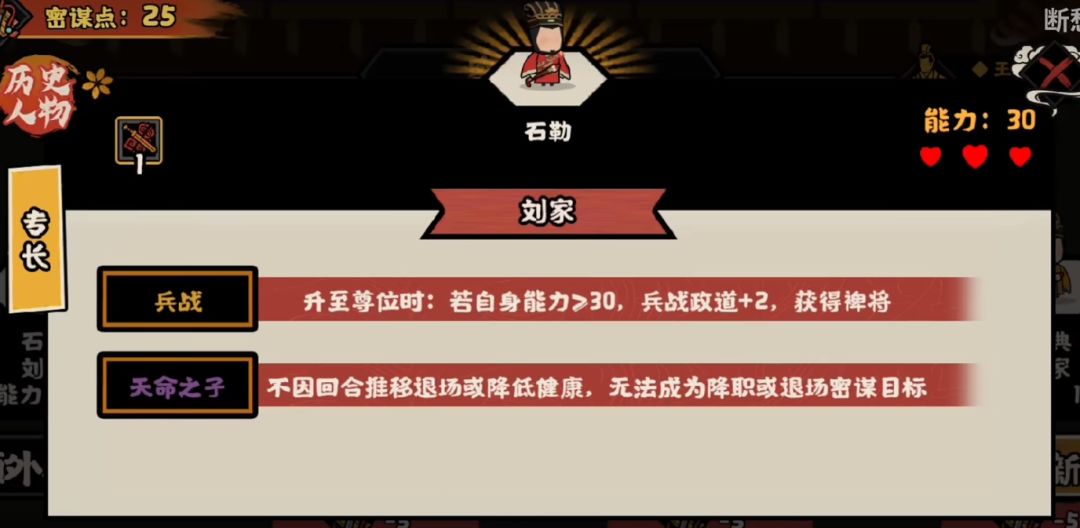 最后是第一批剧本的一些难点。汉赵立业剧本中,一定要先把赵国灭了。然后把石勒收入朝中,升到尊位以后可以增加3点兵战政道,是完成额外任务的必备人选。