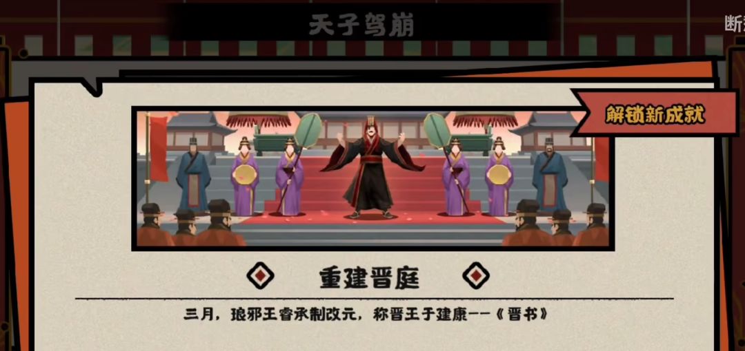 衣冠南渡剧本中,完成胜利目标有一个前置条件是“称帝后”,这需要你在每次自由行动的时候尽可能把主线事件点完,然后才能触发“天子驾崩”的要闻登基称帝,否则你过早达成了要求的目标也是无法触发结局的。