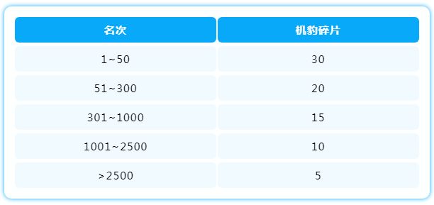 ③只要上榜的玩家都将获得机豹碎片,根据名次将获得不同数量的碎片,请参考下表: