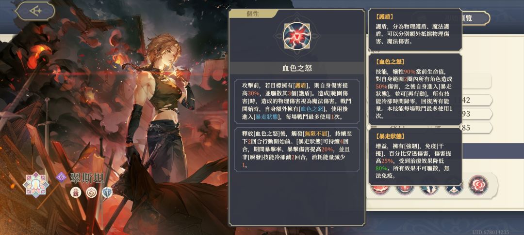 1、从技能看,角色物理转魔法,自带免死技能,前排定位无疑了。输出能力尚可,具有一定AOE和上debuff能力。感觉和熊有点类似,先用技能冲进去,然后开血色免死!然后开始技能反击。你不打她,她就捣乱,但是你又打不死她!