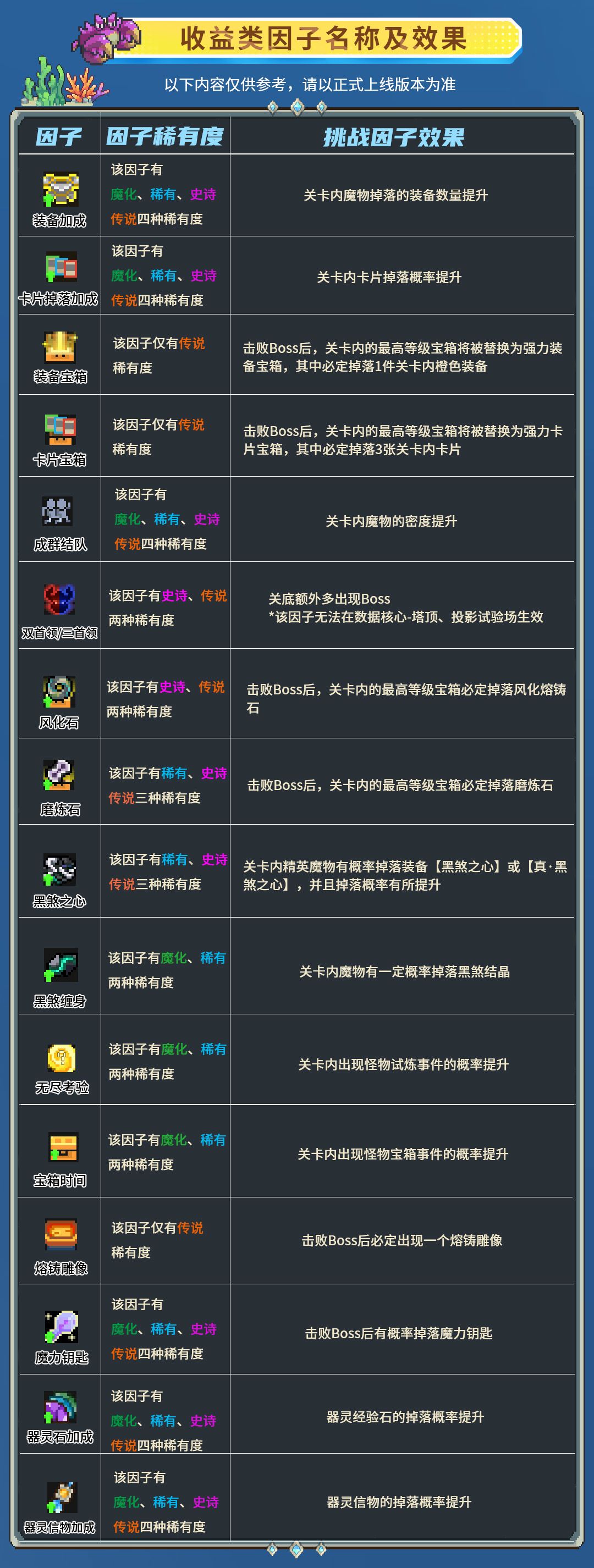 因子类型主要有魔物强化类、全局影响类、收益类三种,当小骑士随机刷出非收益类因子时,将会根据目前已有的因子稀有度刷出因子赏金,赏金将在击败关卡Boss后获得。