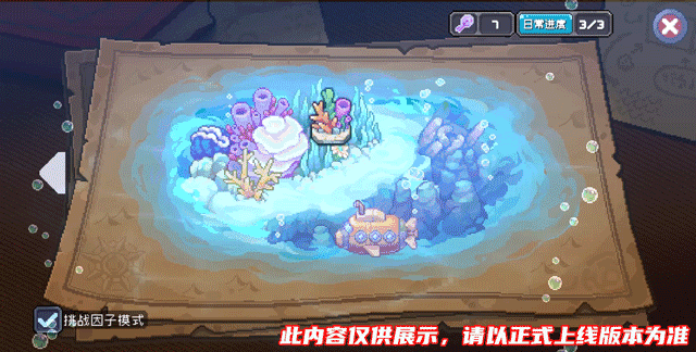 挑战因子为S3深海赛季新增的游戏玩法,当小骑士完成深海探险的主线剧情后将会解锁该玩法。在进入挑战因子模式后,受到海洋石魔力的影响,所有已解锁的游戏关卡将会变成挑战因子关卡,带有“因子”特性。