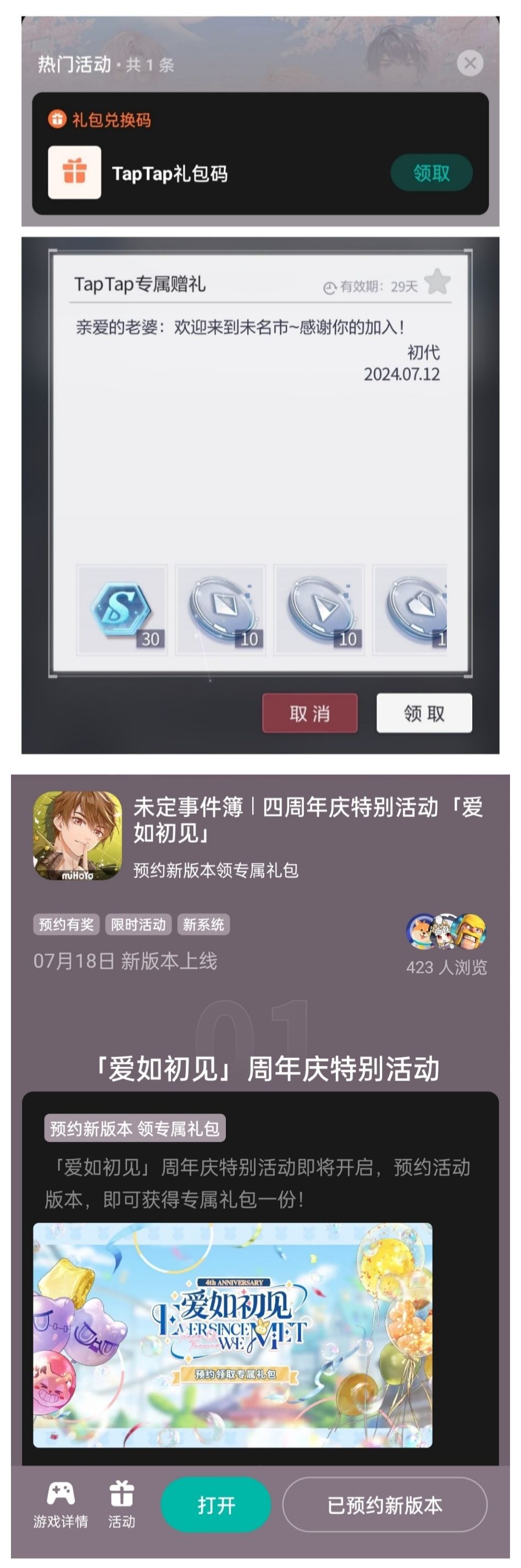 未定四周年专属奖励 30晶片 (taptap游戏库点击未定事件簿,然后在下方活动里面获取兑换码)