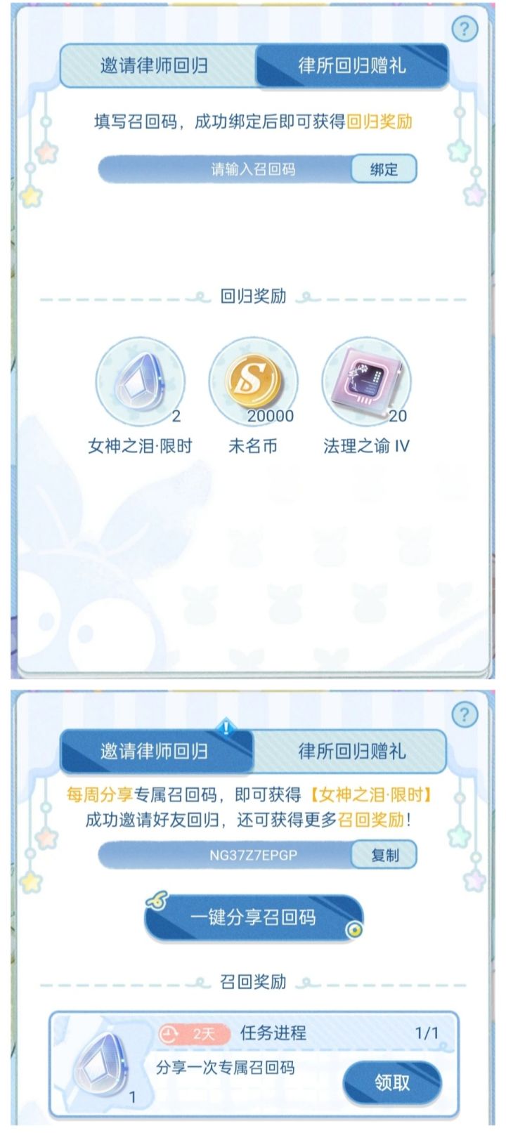 图一:回归奖励 2*限时泪(仅限回归玩家可领取。填写邀请码可以领取,邀请码放在评论区了,谢谢好心的律师小姐)