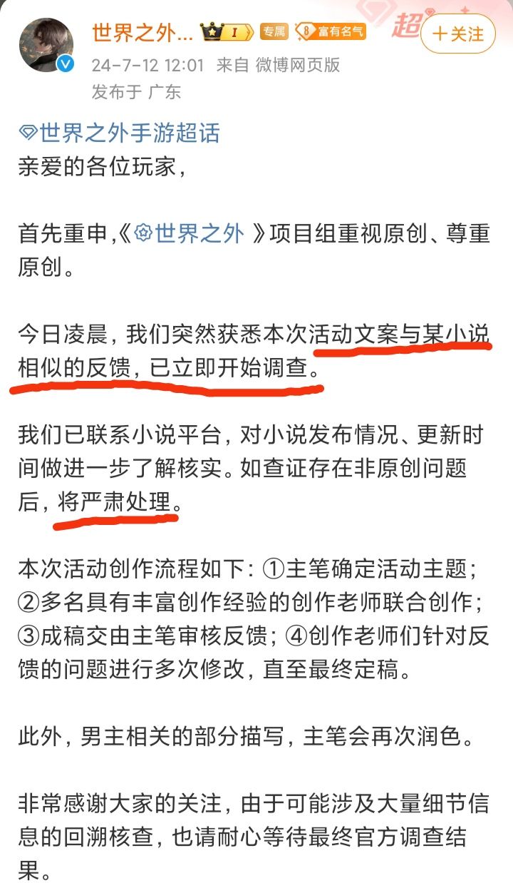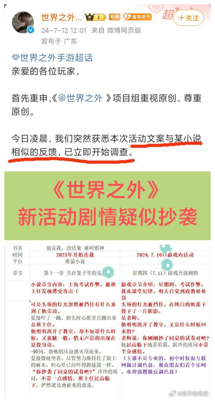 7/12号中午,网易旗下游戏《世界之外》官博发文,对活动文案涉嫌抄袭进行了回应❗❗❗