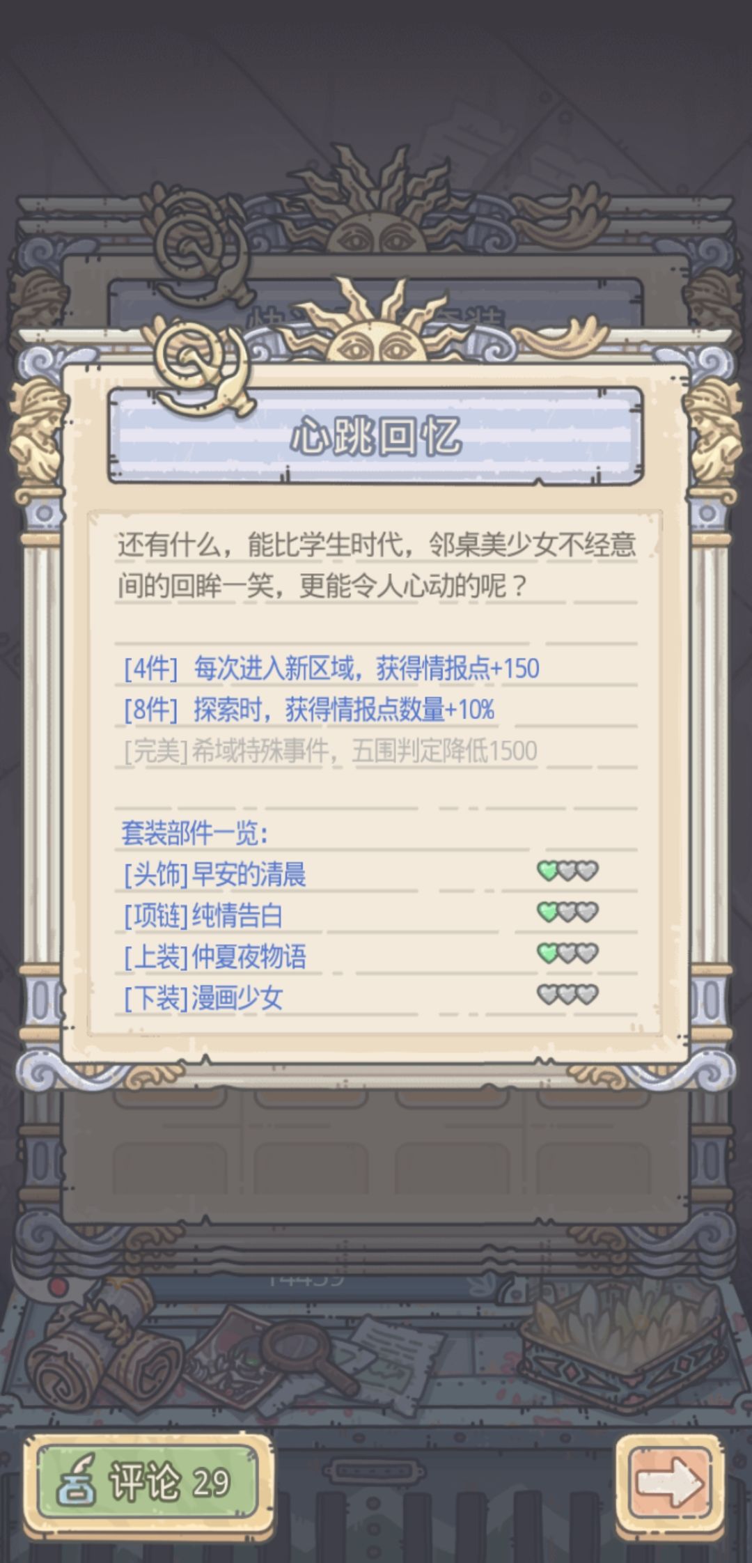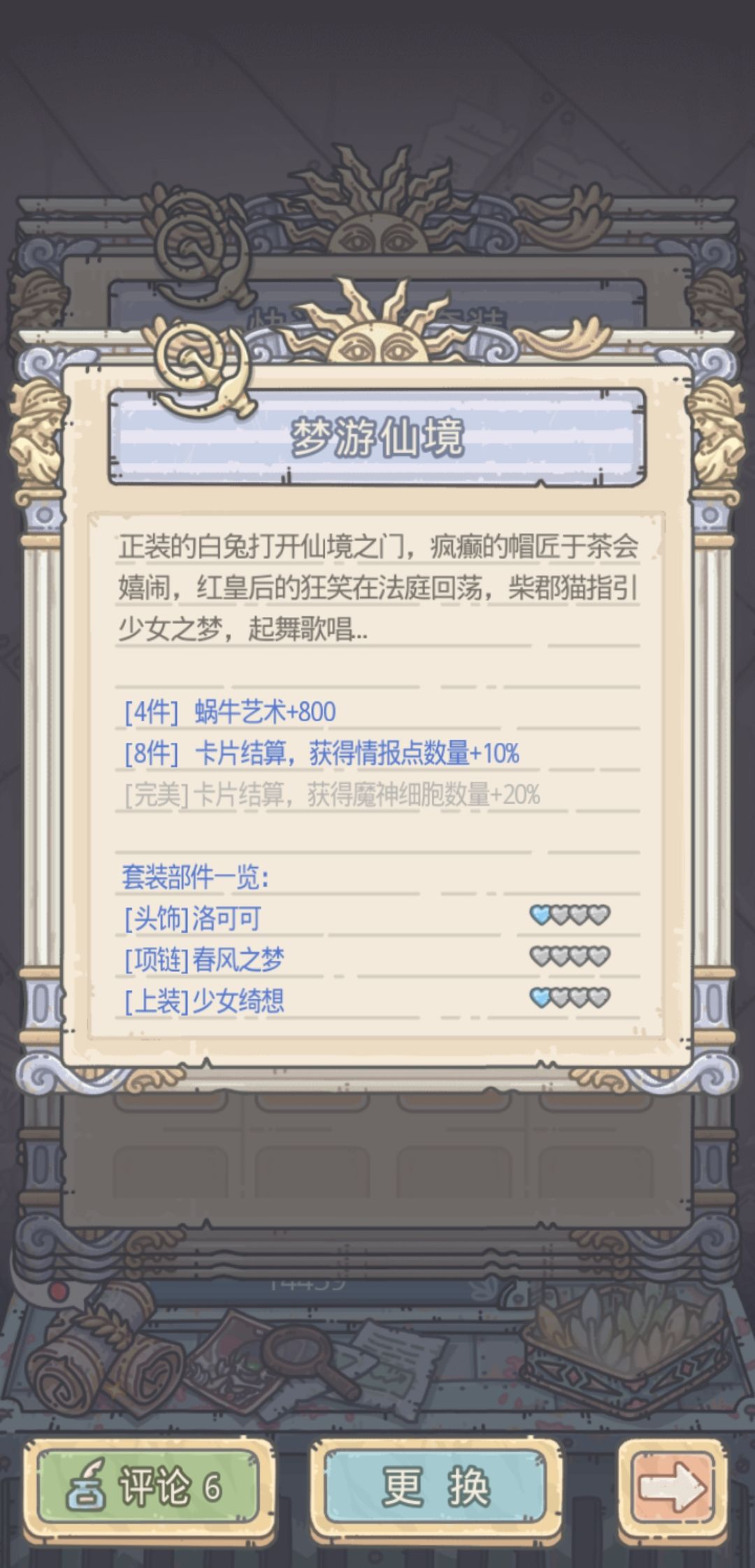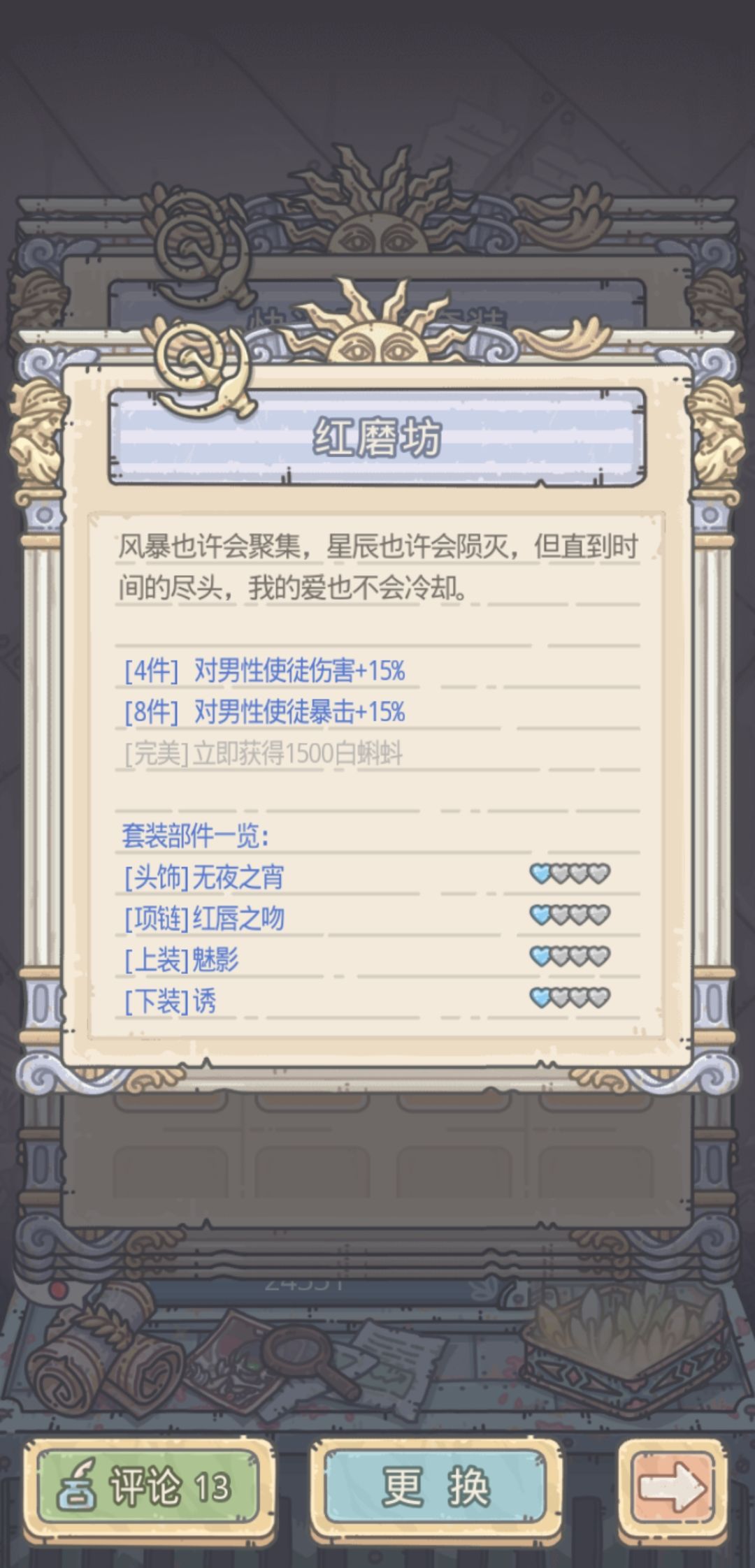 这里还有个技巧,一些四件套的属性是加五维,而且加的很多,所以遇到不能追击的或者特殊事件五维不够的时候,可以换上对应的四件套