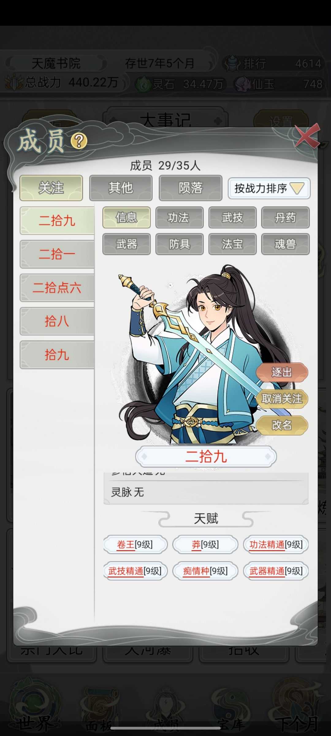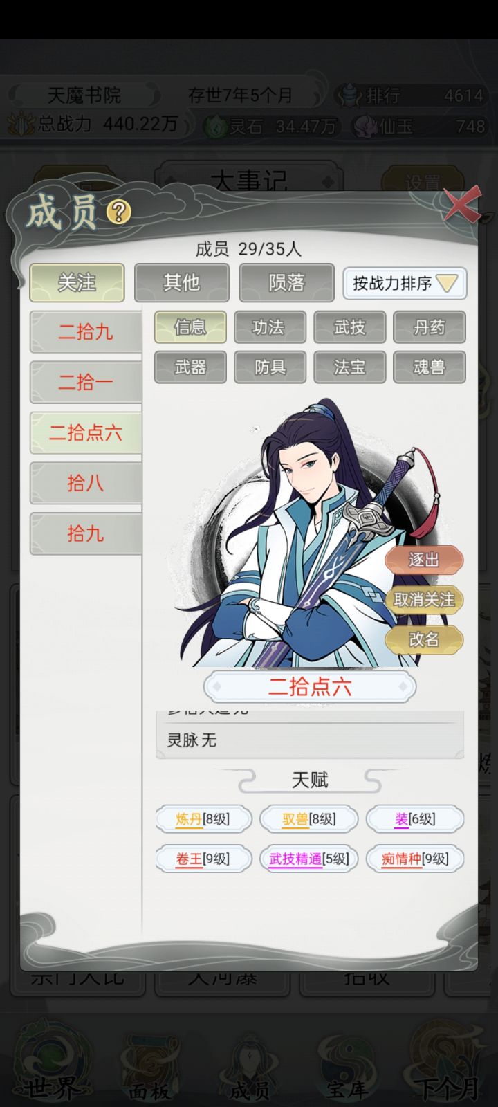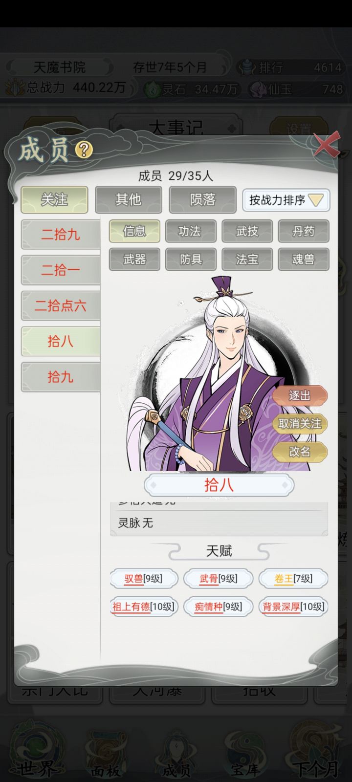 为了避免精神疲劳,我在刷新天赋时根据打分决定要不要。17个战力成员9卷以上或者14分以上就可以了,3个主战成员至少16分以上才考虑,首席大弟子最好20分以上。