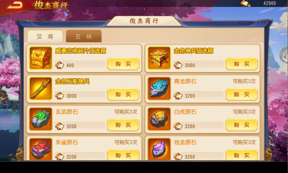 3、主公获得的「五铢钱」可以在五铢商店中兑换你想要的物品哦,原石、礼记周易、将星、洗练石、鲛油长明灯、北斗司南、金色万能神兵等海量道具和资源统统都有。