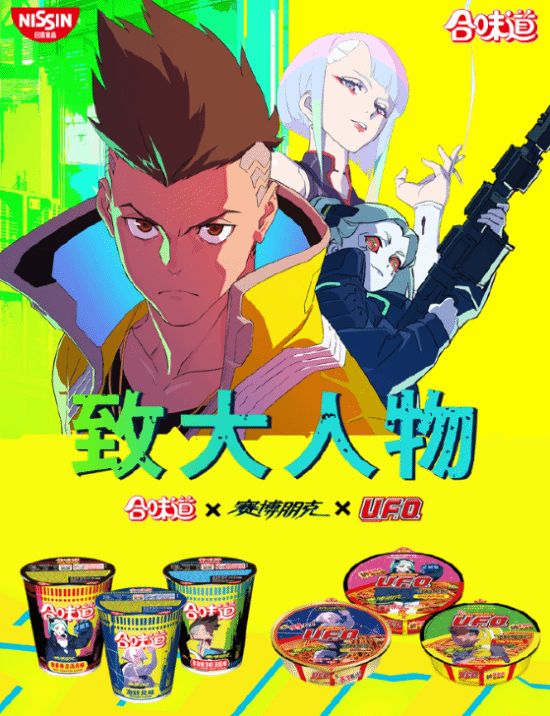 此外,CD Projekt RED与日清食品公司展开合作,推出动画《赛博浪客》的联名方便面,包含「合味道」与「U.F.O」两款产品,分为大卫、露西和瑞贝卡三款不同的联动包装,产品现已正式上市发售。