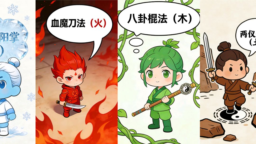 黯然伤神掌、两仪剑法、打狗棍法、八卦棍法。