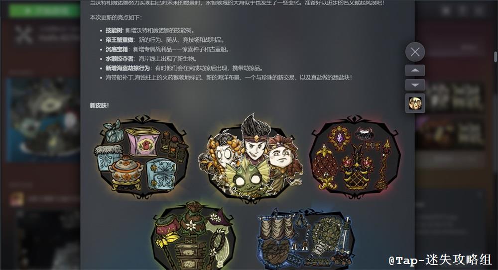 从新王朝,到旧神归来,再到现在的来自域外,联机版剧情逐渐丰富,进入月后时代,在不断的更新中,笔者能够感受到科雷一直在秉持初心,并且在以一种“做慈善”的方式更新,为什么要说是一种“做慈善”的方式更新呢,因为《饥荒:联机版》的后续更新均没有以DLC的形式出现,所有全新的生物群落、所有重做的人物都是可以在拥有本体的基础之上直接游玩的,《饥荒:联机版》的内购内容只物品及人物的皮肤,不过,这些皮肤的定价与其他游戏相比是很便宜的,而且基本上也都可以通过游戏内的线轴编制和开箱免费白嫖。