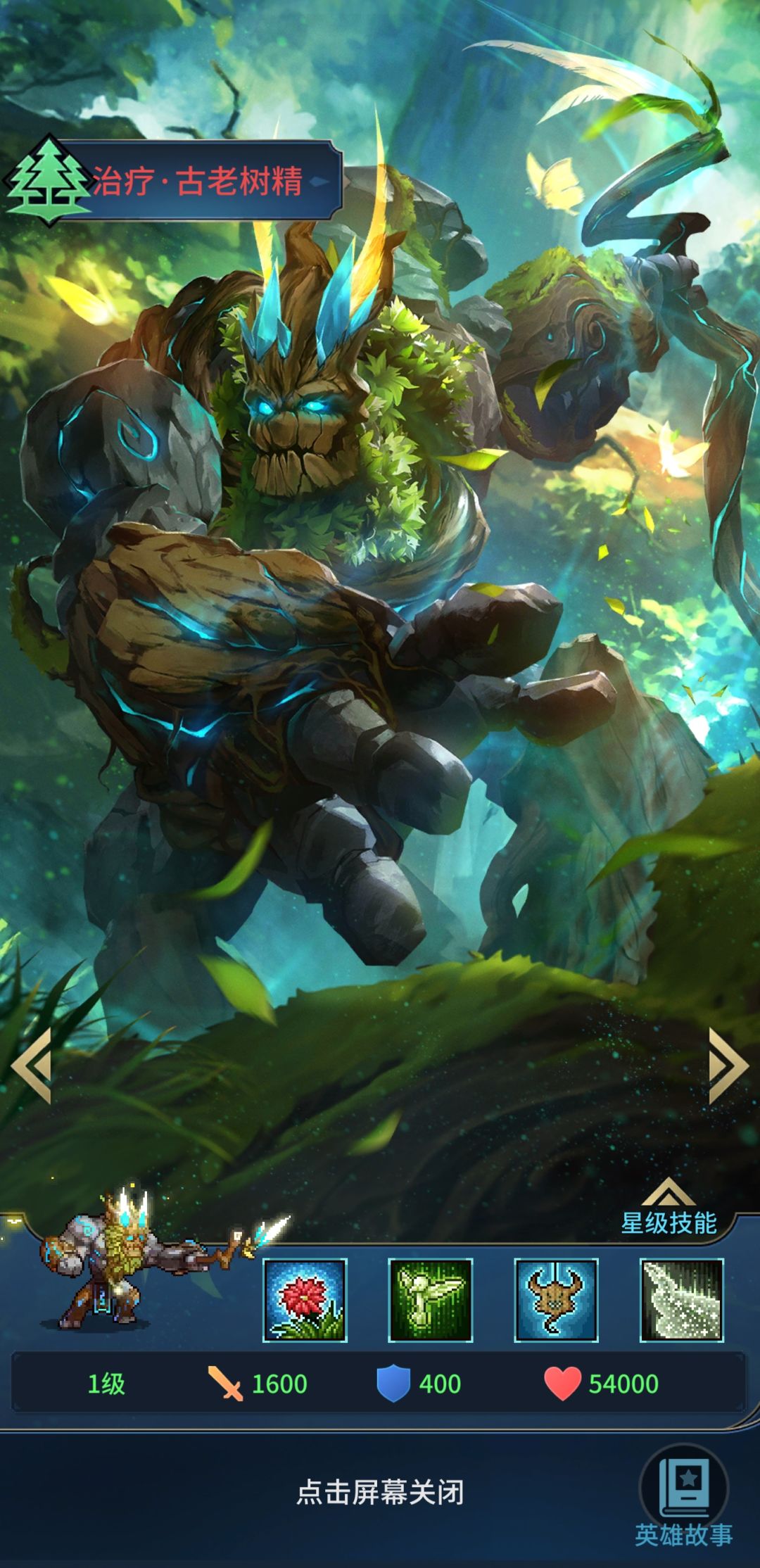 古老树精应该是最抗打的治疗英雄, 战斗中会召唤稻草人,可将自己受到的伤害转嫁到稻草人身上,同时在受击时可提升自己生命上限,在有些关卡需要一个抗打的治疗时、或者pvp对方有切后排的英雄时,他非常适用。