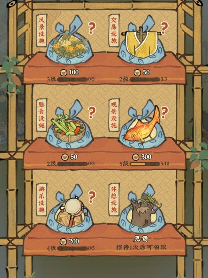 🍎每招待五次可以获得一个休息设施,每个休息设施可以提升招待时来的山精总数,比如你有6个休息设施,那你点击一次招待,可能来1-6个山精,来的越多,奖励越多,奖励也就是白花红花和牛头,其中牛头最重要,牛头是基础,红花数量固定,白花不用管,因为随着前期梭哈牛头数量设施,牛头获取越来越快,到了差不多的时候,招待一次可以获取大量牛头去抽绿花和白花设施,但如果你前面就大量抽其他设施,会导致牛头过去过慢,浪费船票,设施优先级:牛头>绿花>兰花,也就是观景游乐>风景>交易膳食,休息设施是固定的,每招待五次给一个,切记及时布局