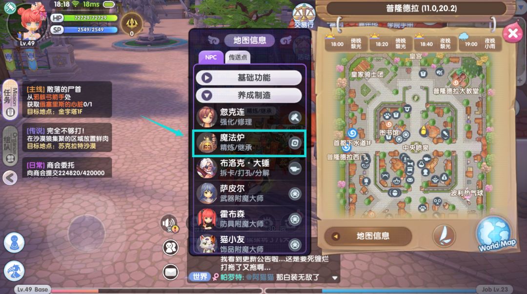 想要精炼装备就要先找到精炼商人的位置,我们只需身处主城点击右上角地图后,再点击屏幕左侧的“养成制造”即可看到精炼NPC“魔法炉”的位置。