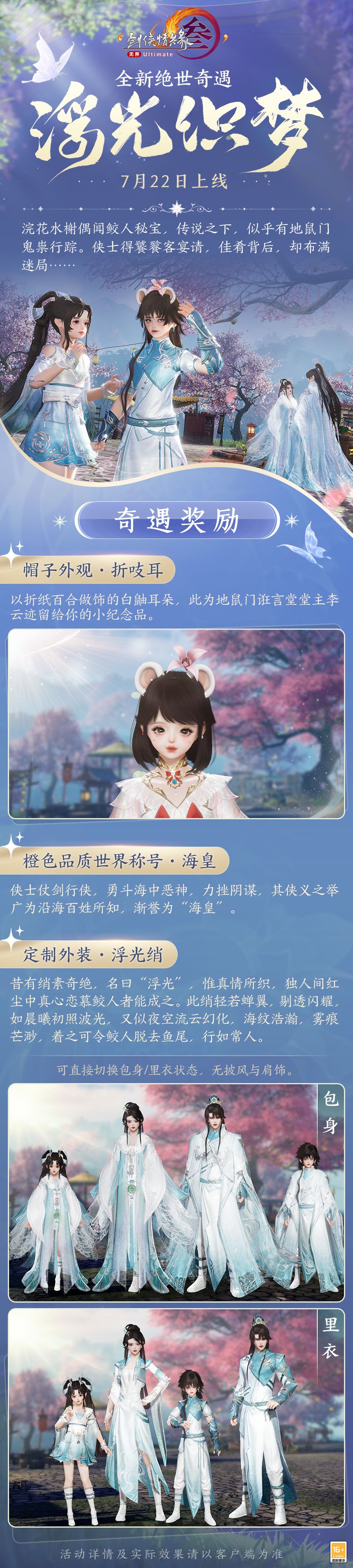 ● 全新免费外装、世界称号以及帽子外观:新免费外装奖励【浮光绡】可直接切换包身与里衣状态!更有橙色品质世界称号【海皇】和奇遇专属奖励帽子外观【折吱耳】,波光潋滟映花台,梦影浮沉幻境开,谁是下一个入梦之人?